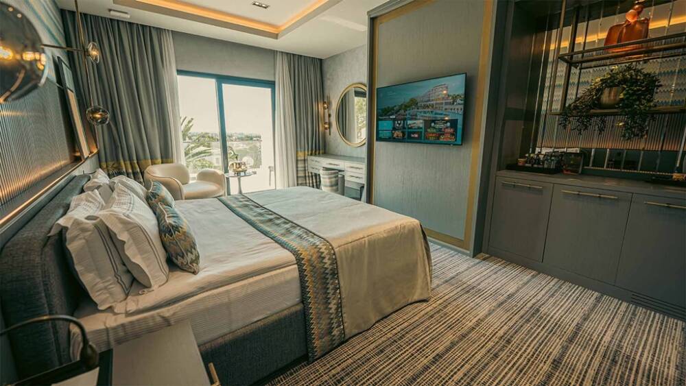 Oda İmkanları: Klima, minibar (ücretsiz ilk dolum), kasa, Wi‑Fi, düz ekran TV, çay/kahve seti, saç kurutma, balkon